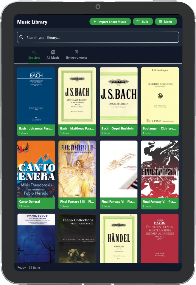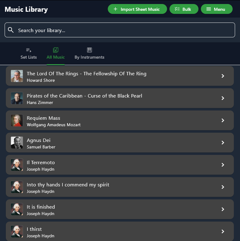 View your sheet music library in All Music, Set Lists or By Instruments. Setlist images are generated but you can set your own! Icons related to the music brighten up your library.