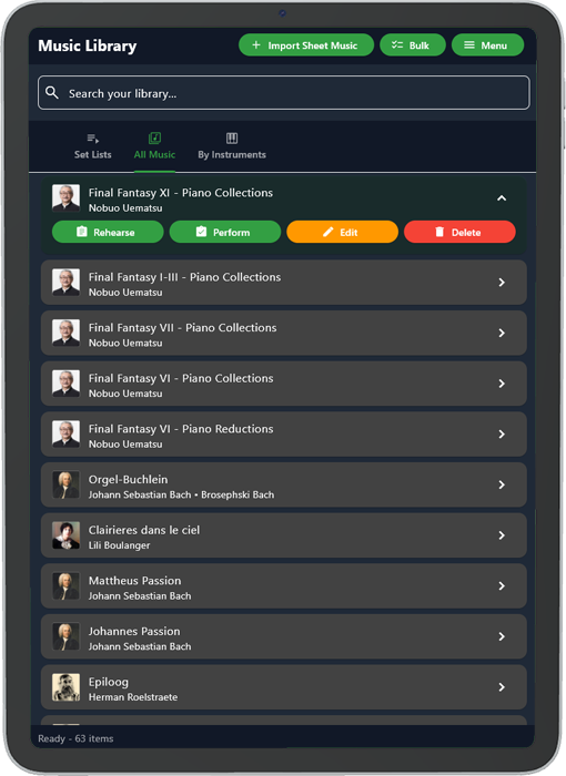 The Library Viewer currently supports three different viewing modes: All Music, Set Lists and By Instrument. The Search Your Library bar works across all three modes and searches not only by title, but also through all of the metadata attached to your sheet music, making it easy to locate exactly what you are looking for. In the settings of your app, you can set which view you want to prioritize.