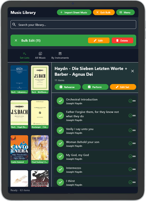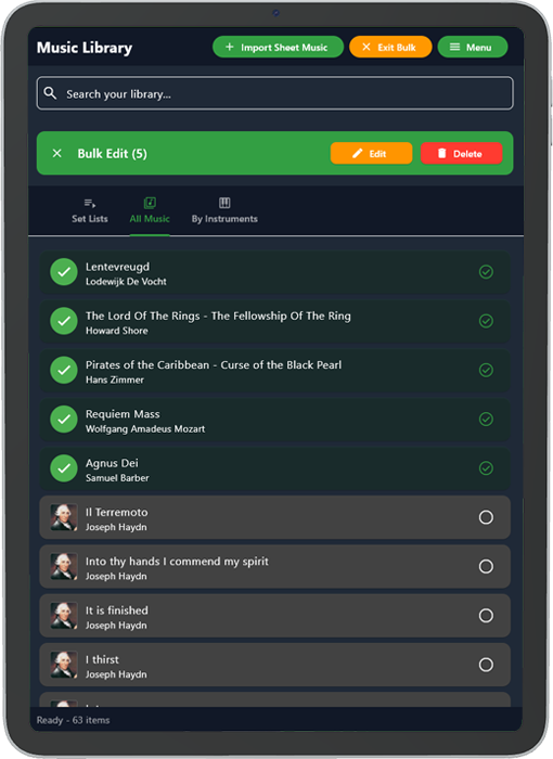 Looking to edit or remove multiple sheet music files at once? We make it simple. Activate Bulk Mode by clicking the bulk button, then select as many sheet music files as you like from any view. From there, you can choose to edit or delete all selected files in one go.