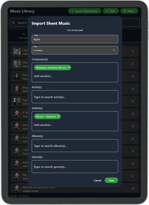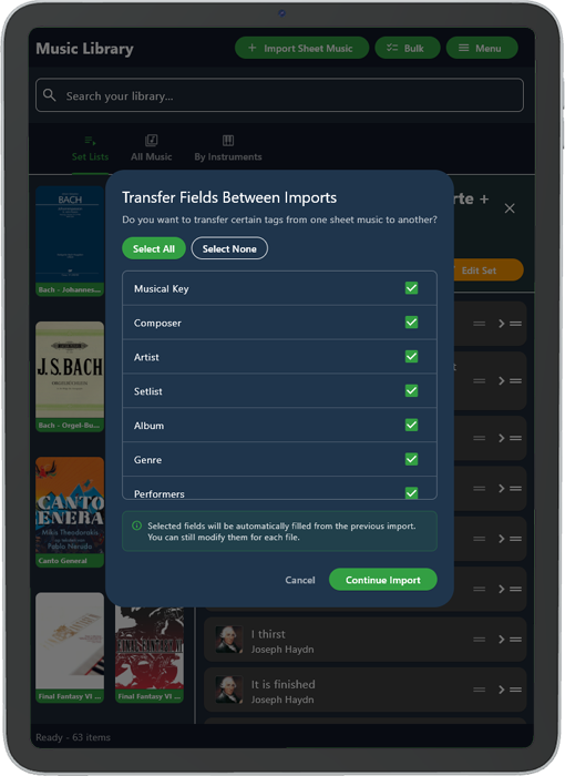 If you want to import multiple pieces of sheet music at once, the process is even easier. During a bulk import, you can choose to transfer metadata fields across all files. At the start of the import you will be asked which fields you would like to apply to every item. For example, if all the music is by the same artist, or if they all belong in the same set, you only need to type it once and it will be automatically applied to every piece in the current import.