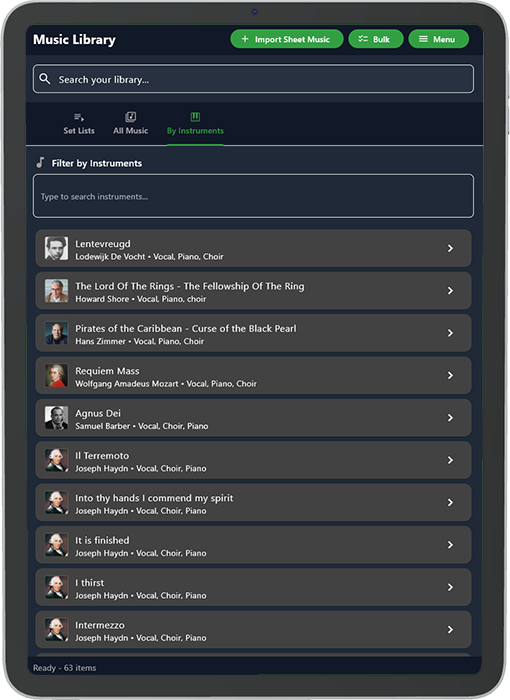 The Library Viewer currently supports three different viewing modes: All Music, Set Lists and By Instrument. The Search Your Library bar works across all three modes and searches not only by title, but also through all of the metadata attached to your sheet music, making it easy to locate exactly what you are looking for. In the settings of your app, you can set which view you want to prioritize.