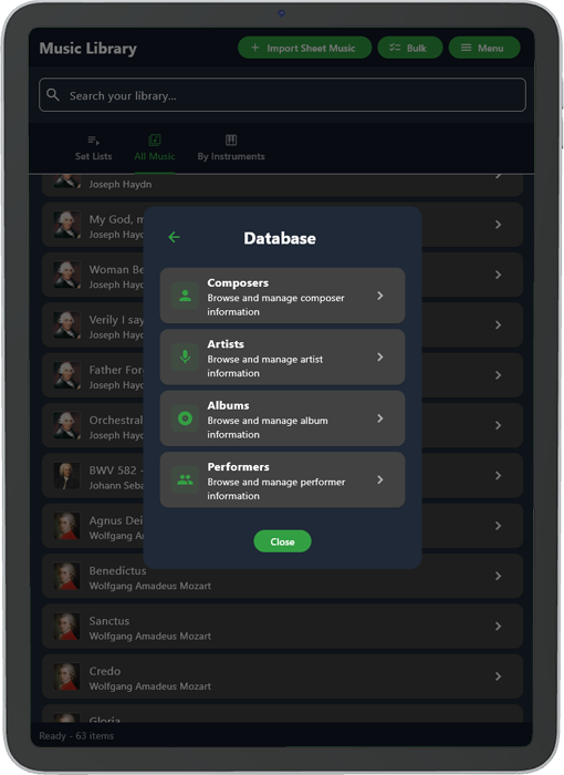 You can view and edit metadata directly from the database section of the library manager. Creating a new entry is as simple as adding a tag when importing sheet music. Once imported, metadata can be refined in the database, and your sheet music will automatically display the corresponding icons based on the data you’ve provided. You can also access detailed metadata information right inside the sheet music viewer.
