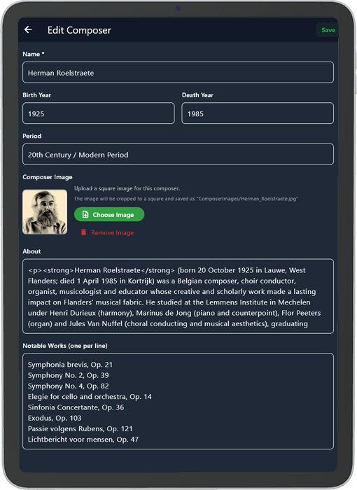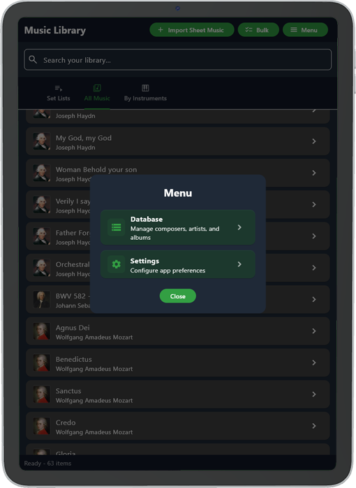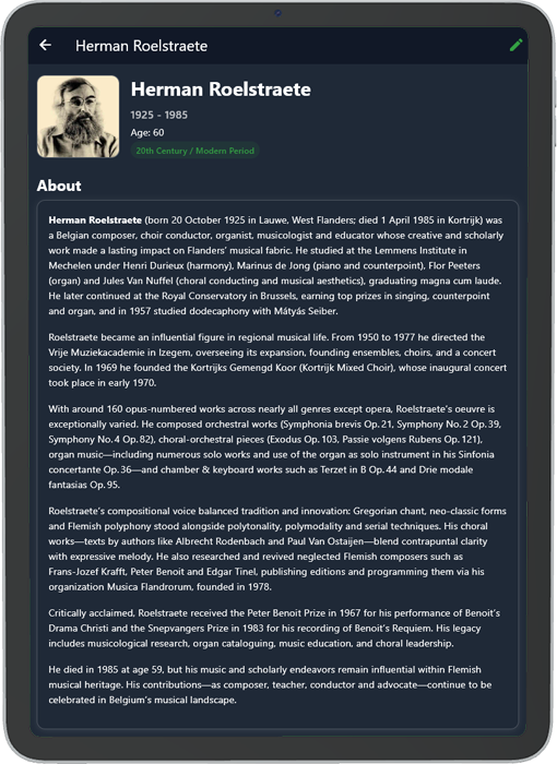 Prefer not to manage metadata manually? Partitura makes it effortless. Metadata can be downloaded online within the app, so your library is enriched the moment you start importing your first pieces. And if you’d like to see specific metadata added to Partitura’s online packs, you can simply send a request from inside the app and your additions will appear soon after!
